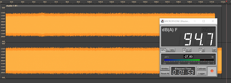 Безопасным уровнем звукового давления при прослушивании музыки считается 75 дБ, но на практике большинство слушателей предпочитает уровень 90–100 дБ. Мы транслируем в наушники белый шум, фиксируя уровень SPL в районе 95 дБ, сразу после старта воспроизведения запускаем запись сигнала с измерительного стенда — по длине получившегося трека легко понять, сколько проработал каждый из наушников.