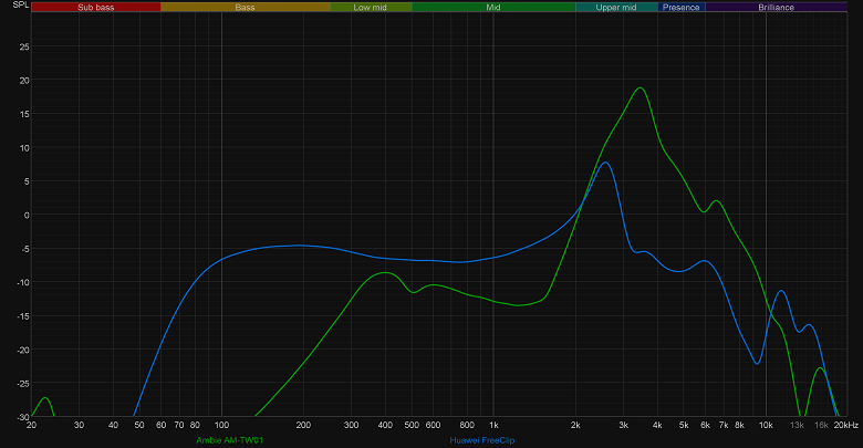 Про микрофоны Ambie AM-TW01 известно крайне немного, вернее — почти совсем ничего. Заявлено лишь, что поддерживается система шумоподавления при звонке CVC8.0. Для измерения АЧХ микрофонов мы используем специально подготовленное помещение и мониторную акустическую систему, воспроизводящую свип-тон. Естественно, что АЧХ колонок далеко не равномерна, потому мы предварительно получаем ее график с помощью калиброванного измерительного микрофона. Далее полученные данные используются для построения корректирующего профиля, призванного скомпенсировать особенности акустики. После этого сигнал записывается с помощью героя тестирования, занимающего то же положение, что и измерительный микрофон ранее. Полученный график корректируется с помощью созданного предварительно профиля и на выходе у нас остается собственная АЧХ тестируемого микрофона.