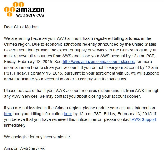 Компания Amazon уведомила пользователей сервисов AWS в Крыму о необходимости удалить свои аккаунты до 13 февраля 2015 года.