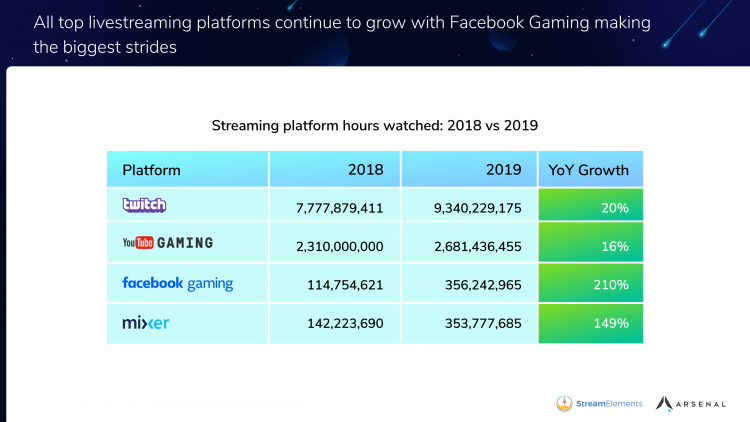 Mixer и Facebook Gaming постепенно наращивали свою долю рынка, инвестируя в рост в течение всего года и переманивая таланты с Twitch: например, Mixer привлёк Ninja, shroud, Ewok и Gothalion, а Facebook Gaming переманила DisguisedToast, ZeRo, NexxuzHD и Lolito FDEZ. Эти шаги, возможно, не дали немедленный эффект, но, как ожидается, окажут существенное влияние в ближайшие годы.