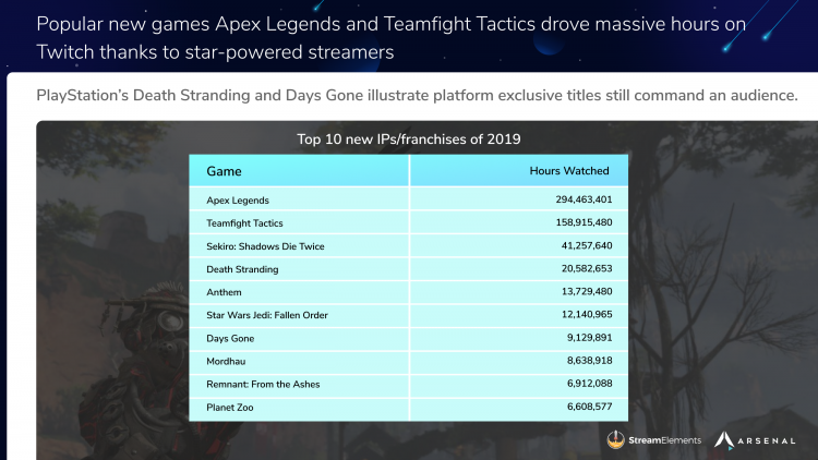 Всякий раз, когда появляется новая амбициозная королевская битва, она вырывается в верхушки чартов. Так было с PUBG, затем с Fortnite, а теперь и с Apex Legends. Хотя Apex Legends оказались в нижней части общей десятки наиболее популярных игр, среди новых проектов творение Respawn Entertainment почти вдвое обошло следующего участника списка. Также следует отметить Death Stranding — первую игру Хидео Кодзимы (Hideo Kojima) после ухода из Konami. Она получила 20 миллионов зрительских часов, что неплохо для игры, выпущенной в ноябре и вдобавок эксклюзива PlayStation 4 (в следующем году она также выйдет на ПК).