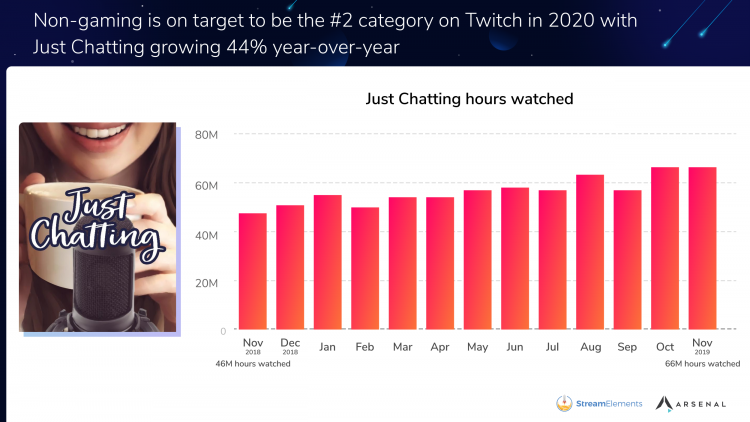 «Просто чат» — категория просто живого видеоблога — продолжает устойчивый рост ко второму месту в общем игровом графике (да, это не игра, но тем не менее). Постоянный рост этой категории стримов постепенно размывает чисто игровую направленность Twitch.