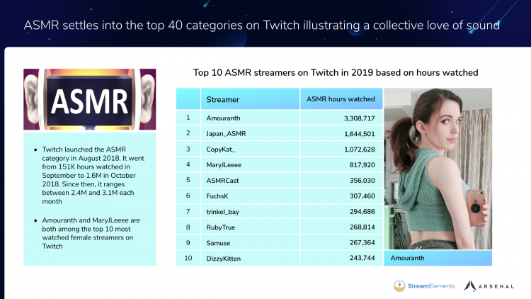 Хотя материалы АСМР (эффект так называемой автономной сенсорной меридиональной реакции) не настолько же популярны, как и «Просто разговоры», эта категория тоже достигла солидных успехов — ежемесячно просматривается от 2,4 млн до 3,1 млн часов соответствующего видео, а возглавляет список Amouranth.