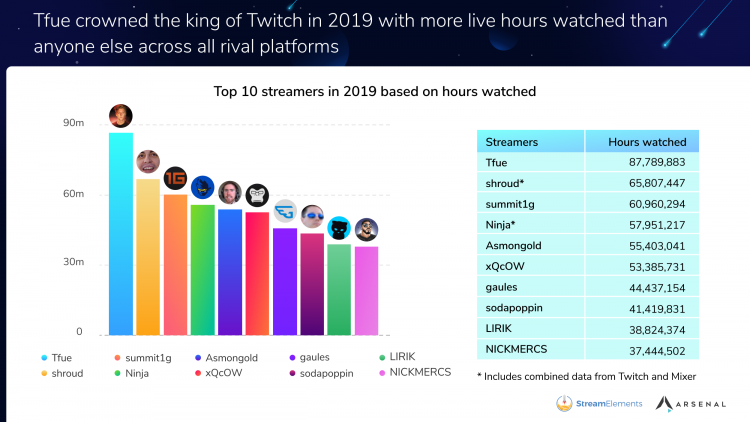 В списке из десяти наиболее популярных стримеров доминировал в этом году один человек: Tfue. Профессиональный игрок в Fortnite даже брал небольшой перерыв в 2019 году, но это не помешало ему набрать 87 млн часов просмотра. Это была не единственная история успеха. Когда Blizzard запустила World of Warcraft Classic, Asmongold был лучшим стримером на Twitch 3 месяца подряд.