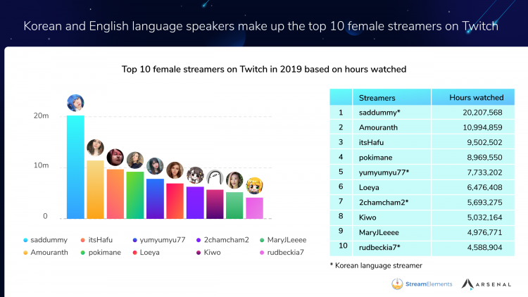 Четыре корейскоговорящих блогера в этом году вошли в список самых популярных женщин-стримеров. В эту четвёрку входит и Saddummy, которая заняла первое место, получив более 20 миллионов часов просмотра. Причём её основная категория — «Просто разговоры»