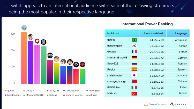 Учитывая популярность потоковых служб во всём мире, не обязательно говорить на английском, чтобы найти аудиторию. Португальский, корейский, французский, итальянский, немецкий, испанский, турецкий, русский, японский и китайский были наиболее популярными языками среди игровых стримов в 2019 году. Однако в десятку наиболее популярных в мире вошёл только один неанглоязычный стример — португальский gaules, собравший 44 млн просмотров. Самого популярного русского блогера Stray228, для сравнения, смотрели 15 млн раз.
