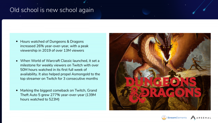 Grand Theft Auto V вышла в 2013 году, World of Warcraft — в 2004-м, а Dungeons & Dragons — в 1974 году. Так почему же мы говорим о них сегодня? Всё дело в том, что стримеры возродили к ним интерес. Ностальгия помогла повысить интерес к World of Warcraft с помощью популярных стримеров и привлечения поборников. Возрождение интереса к Dungeons & Dragons на Twitch восходит к 2010 году.