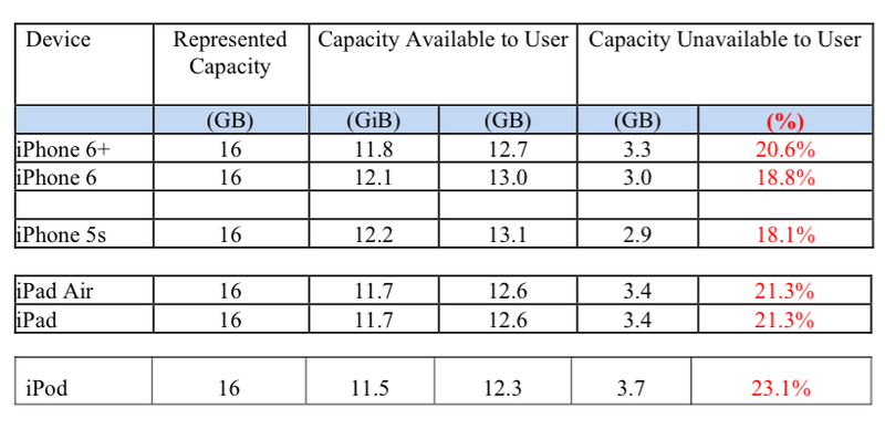 Согласно обвинению, в последних 16-Гбайт версиях устройств Apple конечному пользователю недоступно от 18,1% до 23,1% общего объёма (в зависимости от аппарата):