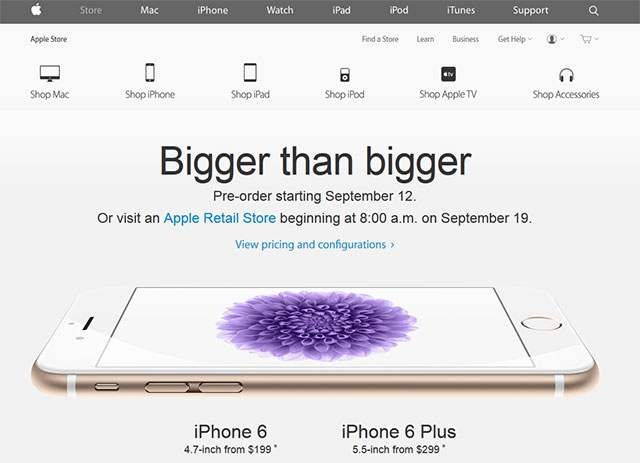 Помимо новой страницы с часами Apple Watch появился также раздел, посвящённый новым iPhone 6. Да и в целом дизайн сайта был переработан: в частности, появилось плоское меню в духе iOS 7 и 8. Кроме того, компания выпустила также мобильную версию ресурса, которая поддерживает управление жестами. После небольшого перерыва заработал и интернет-магазин.