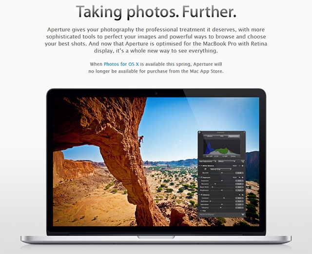 Недавно Apple представила предварительную версию OS X 10.10.3 для разработчиков, а теперь купертинская компания обновила официальную страницу профессионального графического редактора Aperture на своём сайте, сделав пометку, что программа будет удалена из магазина приложений Mac App Store вслед за iPhoto после выхода Photos для OS X.