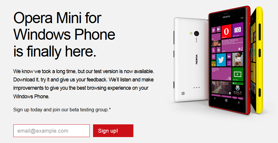 Теперь владельцы устройств с операционной системой Windows Phone получили возможность присоединиться к тестированию бета-версии Opera Mini. Для этого необходимо указать в форме по ссылке свой электронный адрес и ждать, когда на него придёт ссылка для скачивания приложения.