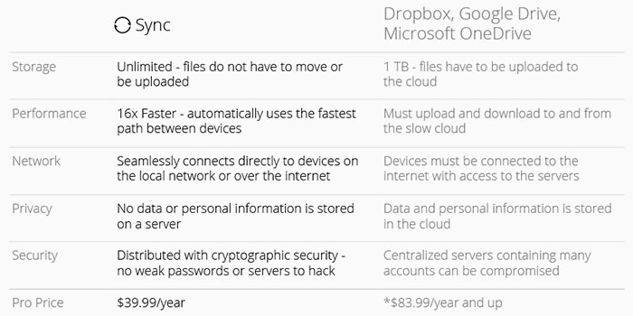 BitTorrent противопоставляет Sync таким службам, как Dropbox, Microsoft OneDrive или Google Drive, отмечая, что в конкурирующих сервисах 1-Тбайт облачные хранилища обходятся $84 в год или больше. Однако сравнение Sync 2.0 с указанными службами не вполне корректно. Дело в том, что Sync вовсе не предусматривает наличие облачного хранилища, а предлагает создавать собственное частное облако. К его плюсам можно отнести высокую скорость за счёт распределённой пиринговой сети (сервис выбирает оптимальный путь доставки данных), приватность (никакие личные данные или файлы не хранятся на удалённых серверах), более высокую безопасность (также ввиду отсутствия централизованного сервера), отсутствие ограничений на объём хранилища и отдельных файлов, отсутствие необходимости закачивать файлы в облако для обмена с другими устройствами. Таким образом, у службы есть как собственные плюсы, так и минусы.