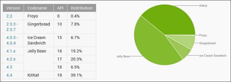 На втором месте по популярности находится Android 4.4 KitKat с результатом в 39,1%. То есть, Jelly Bean и KitKat сообща занимают приблизительно 85% Android-рынка.