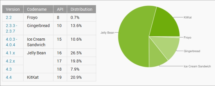 Тем не менее, пока самой распространённой редакцией Android является Jelly Bean. В частности, на версии 4.1.x приходится 26,5% рынка, на модификации 4.2.x — 19,8%. Ещё 7,9% удерживает версия 4.3. Таким образом, суммарная доля различных редакций Jelly Bean составляет 54,2%. Месяцем ранее этот показатель равнялся 56,5%.