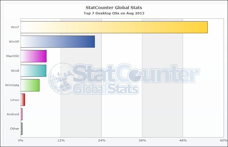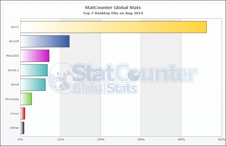 По данным StatCounter, в начале августа 2014 года различные операционные системы Windows занимали приблизительно 89% глобального рынка программных платформ для персональных компьютеров.