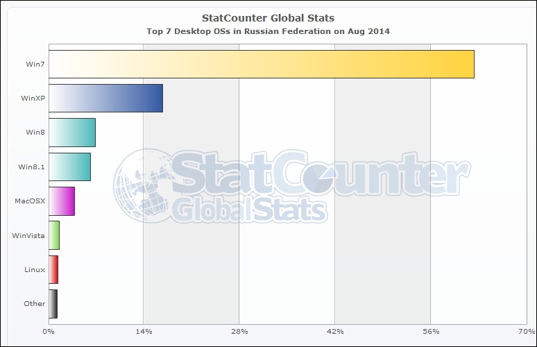 В России безоговорочным лидером является платформа Windows 7, которая в начале текущего месяца занимала 62,3% рынка. Предпочтение Windows ХР, по данным StatCounter, пока отдают 16,8% владельцев компьютеров в нашей стране. Далее следуют Windows 8 и Windows 8.1 с результатом в 6,9 и 6,1% соответственно. Mac OS X занимает около 3,8% российского ПК-рынка.