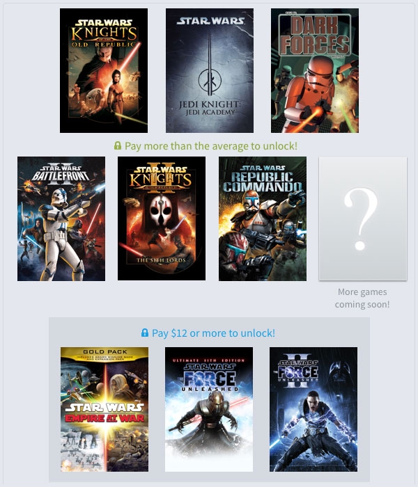 Если оплачиваемая сумма выше средней, то вдобавок игрок сможет загрузить Star Wars Republic Commando, Star Wars Knights of the Old Republic II: The Sith Lords и Star Wars Battlefront II. Наконец, если заплатить $12 или выше, то вдобавок ко всему перечисленному покупатель приобретёт Star Wars: The Force Unleashed II, Star Wars The Force Unleashed: Ultimate Sith Edition и Star Wars Empire at War: Gold Pack.