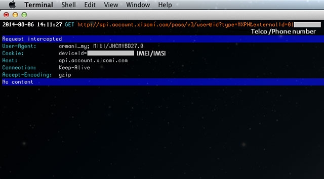 В результате выяснилось, что аппарат вначале отправляет имя телекоммуникационной компании на сервер api.account.xiaomi.com, затем туда же отправляются идентификаторы IMSI, IMEI и номер телефона. Затем в указанном направлении отправляются телефонные номера контактов из телефонной книги, а также номера людей, от которых получены SMS. При подключении облачной службы Mi Cloud, как выяснили исследователи, та же информация отправляется на указанный сервер.