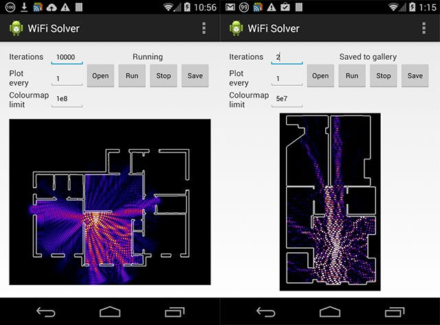 Впрочем, когда есть возможность монетизировать свой труд, вряд ли стоит от этого отказываться. И Джейсон Кол уступил настойчивым просьбам, выпустив Android-приложение WiFi Solver DFTD по символической цене $0,83. Пользователи могут ввести планировку собственного помещения в виде файла PNG (1 пиксель = 1 см реального пространства). При этом автор отмечает, что его Nexus 4 справляется с задачей очень медленно. Результаты расчётов можно экспортировать в виде изображений.
