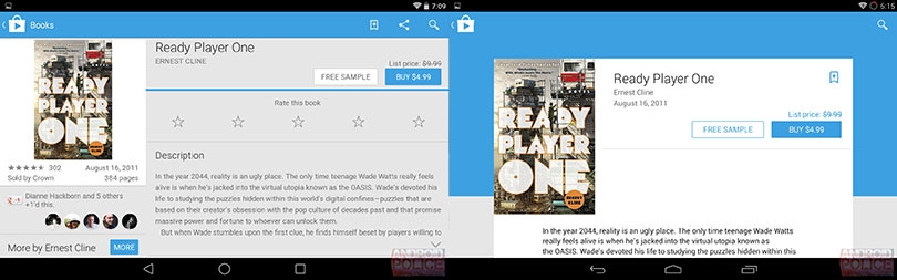 Страницы товаров стали куда более красочными и эффектными благодаря активному использованию больших изображений. В центре обновлённых страницы приложений и игр — картинки или промо-ролики, уже загруженные в магазин Play, в фильмах для этой цели применяются трейлеры, в книгах и журналах — расширенные блоки заголовков, так как их прямоугольные изображения не очень хорошо подходят в качестве полноэкранных изображений. Как это выглядит на планшете (слева — текущая версия Google Play; справа — предварительная новая версия магазина):