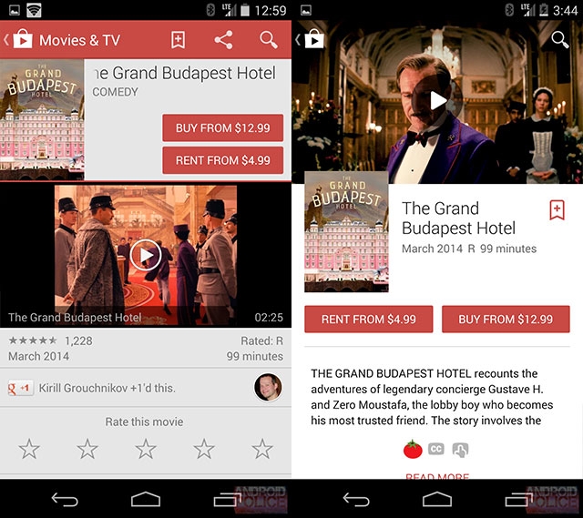 Для тех, что следил за сессиями, посвящёнными дизайну во время конференции Google I/O в этом году, скриншоты справа покажутся знакомыми. В частности, похожая страница фильма «Отель «Гранд Будапешт» была показала во время сессии о философии дизайна Material на примере Google Play. Вот показанная на сессии страница (выглядит похоже на вышеприведённые скриншоты предварительной версии Play):