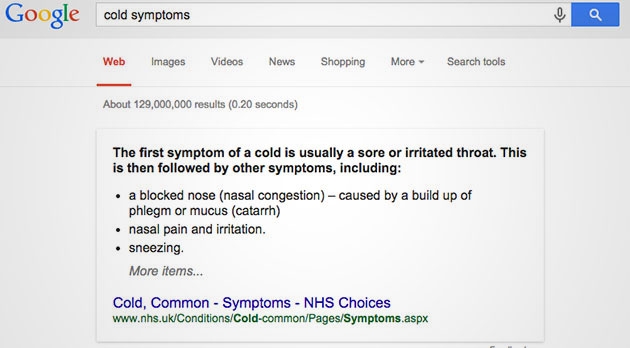 Теперь Сеть знаний работает и в отношении различных заболеваний. Например, при поиске симптомов простуды выведется карточка, описывающая насморк, раздражение носа, боли в горле, чихание, а также предложит, например, англоязычным пользователям проследовать на сайт Государственной службы здравоохранения Великобритании для получения дополнительной информации.