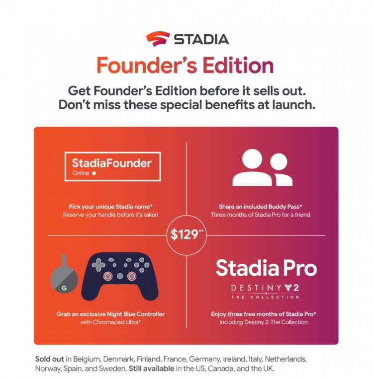 В состав Founders Edition вошли Chromecast Ultra, ограниченный выпуск геймпада в цвете Night Blue, трёхмесячная подписка на Stadia Pro для пользователя и одного друга, а также возможность досрочно зарезервировать уникальный никнейм. Его можно было приобрести за €129.