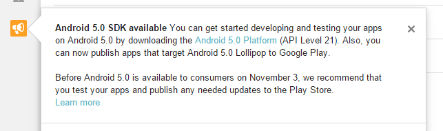 Корпорация Google разослала разработчикам приложений для своей мобильной операционной системы письма с уведомлением о том, что обновление Android до финальной версии 5.0 Lollipop станет доступным пользователям третьего ноября. Поэтому Google напоминает, что уже сейчас авторы ПО могут воспользоваться Android 5.0 SDK для написания и тестирования собственного программного обеспечения, работающего с новой версией ОС, внести заранее необходимые корректировки в ПО и подготовить приложения для размещения в цифровом магазине Google Play.