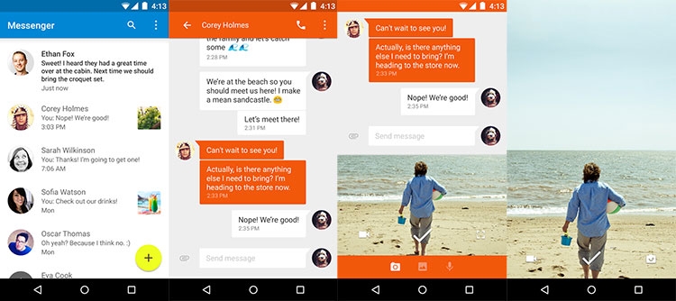 для отправки контактам пользователь может выбирать отснятые ранее фото- и видеофайлы или снимать их прямо в приложении, поддерживается запись голосовых сообщений; обещан удобный поиск нужных контактов и сообщений; возможность настройки уведомлений — когда пользователь занят, они не будут его отвлекать; присутствуют смайлики, выделение цепочек сообщений разными цветами, архивирование и так далее. Разумеется, приложение выполнено в духе нового «вещественного» дизайна Google с яркими сочными и однотонными цветами, тенями и анимацией — компания обещает, что интерфейс интуитивно понятен. В целом, этот мессенджер явно создан для работы с Android 5.0, хотя поддерживаются и более ранние ОС — Android 4.1 и выше.