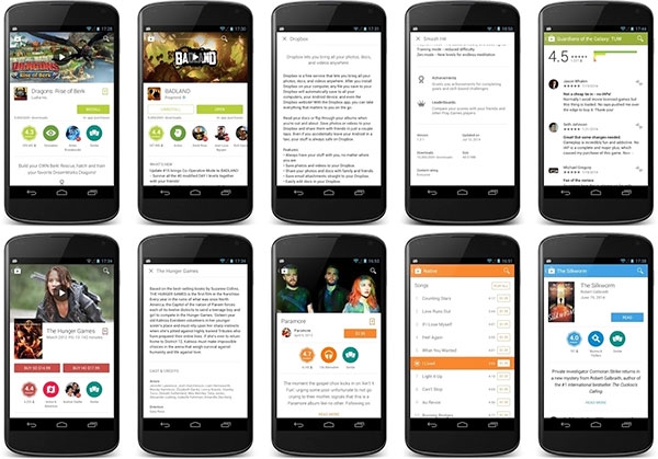 По случаю обновления команда Google Play опубликовала в Twitter запись: «Наше последнее обновление уже поступает на аппараты пользователей. Мы рады поделиться примерами того, что вы получите в ближайшие дни». Теперь куда более значительную роль в новом магазине играют изображения, видео и другой графически богатый контент. Страницы стали чище, а детали вроде рейтинга, обзоров и жанров стали более заметными и наглядными.
