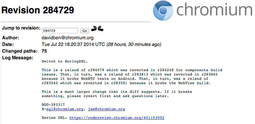 Теперь Google использовала BoringSSL в последней сборке открытого браузера Chromium — со временем это новшество затронет и официальный браузер Chrome. Кстати, во время анонса BoringSSL поисковый гигант отметил, что он не стремится заменить OpenSSL, и все будущие исправления будут отправляться разработчикам оригинального криптографического пакета.