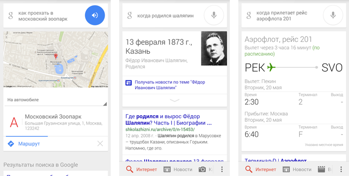 Как сообщается в официальном блоге разработчиков компании, теперь система голосового поиска стала более совершенной и интерактивной, научилась произносить вслух ответы на некоторые типы запросов, поддерживать с пользователем короткую беседу и даже выполнять некоторые просьбы. В частности, система позволяет отвечать на вопросы о предметах, явлениях, людях, погоде и времени в городах мира (Когда родился Бродский? Какая погода в Риме? Сколько времени в Гонконге?), предоставлять информацию об организациях, авиарейсах, котировках акций и прокладывать маршруты (До скольки работает ГУМ? Проложи маршрут до Шереметьево), выполнять математические вычисления (Сколько будет 1856 умножить на 32? Корень из 64?) и прочие действия. Более того, голосовой поиск может «понимать» связи между несколькими запросами и вести с пользователем диалог. Если произнести «Где родился Олег Меньшиков?», а сразу после этого «Кто его жена?» Google поймет, о чьей супруге идет речь.