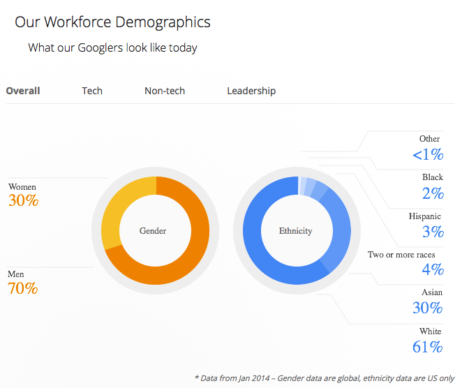 Всего 2% сотрудников Google имеют чёрный цвет кожи, 61% сотрудников — белые, 30% — азиаты, 3% — из испаноговорящих стран.