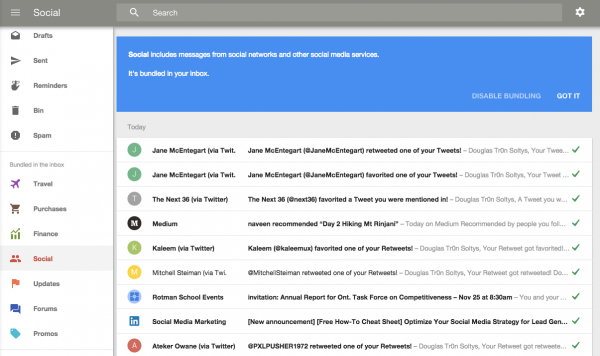 В разработке Inbox участвует та же команда, которая занималась созданием почтового сервиса Gmail. Приложение отличается от своих конкурентов тем, что оно автоматически сортирует сообщения и оптимизирует работу пользователя. Оно отображает в отдельных окнах уведомления социальных сетей, банковские письма, деловую переписку и прочее.