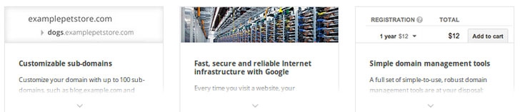 Domains использует те же надёжные DNS-серверы, что и собственные службы Google, и позволяет регистрировать адреса в самых новых доменах вроде .guru и .photography, которые сейчас активно вводятся, создавать поддомены и до 100 адресов электронной почты. Предоставляется возможность легко настроить переадресацию, то есть подключение домена к уже работающему сайту.