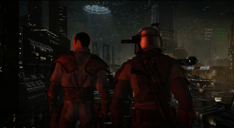 На обоих кадрах изображён главный герой проекта — наёмник Боба Фетт. В первом случае антураж идентичен появившемуся ранее скриншоту: ночной вид города-планеты Корусант.