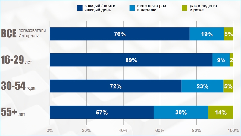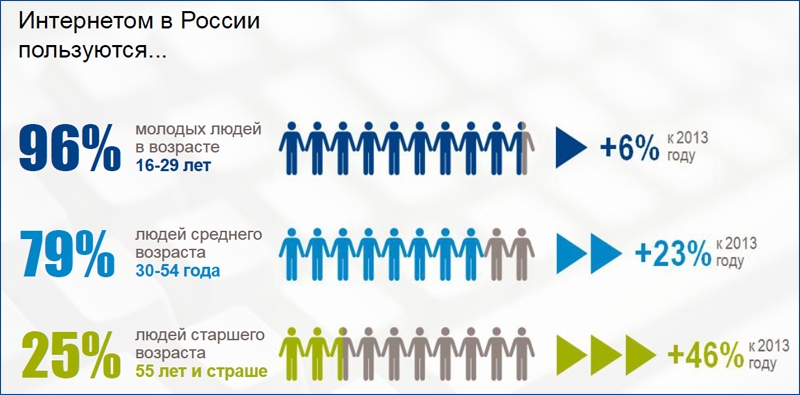 Отмечается, что Интернетом в нашей стране пользуются 96% молодых людей в возрасте от 16 до 29 лет. В возрастной категории 30–54 года этот показатель несколько ниже — 79%. Интернет также необходим четверти россиян старше 55 лет.