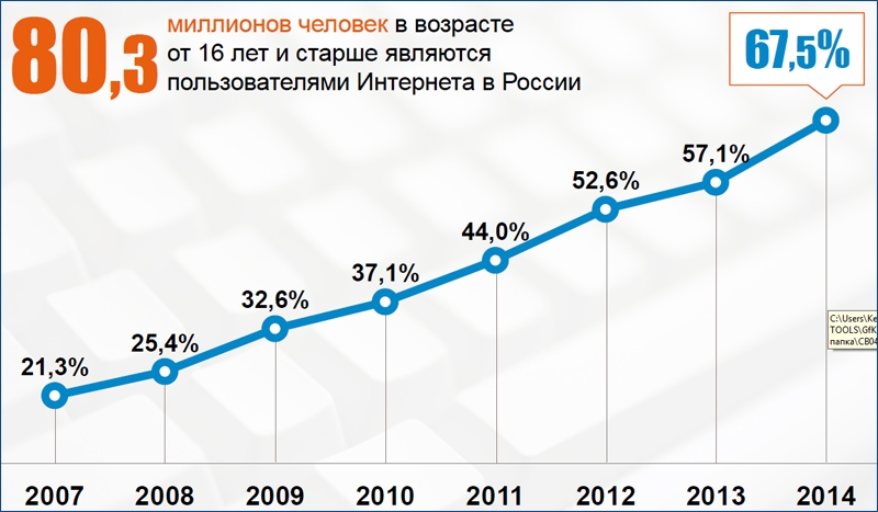 По оценкам GfK, к концу 2014 года уровень проникновения доступа в Интернет среди населения России в возрасте от 16 лет и старше составил 67,5%. Таким образом, численность сетевой аудитории в указанной возрастной группе превысила 80 млн человек. Причём три четверти из них выходят в Интернет ежедневно или почти каждый день.