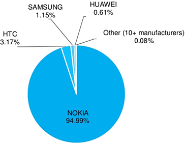 Относительно производителей можно сказать, что бренд Nokia занимает 95% рынка, за ним следуют HTC, Samsung и Huawei, а также более десятка почти ничего не значащих компаний.