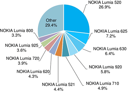 Наиболее популярным в мире WP-смартфоном является самый дешёвый в линейке Lumia 520 — ему принадлежит 26,9% рынка. Ближайшим после него идёт Lumia 625 с 7,2%, а за ним следует более новая модель Lumia 630 с 6,4%.