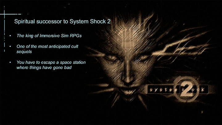 По всей видимости, в Сеть попали ранние документы, поэтому стоит иметь в виду, что информация могла устареть. В пользу этого свидетельствует список целевых платформ: помимо PC указаны Durango и Orbis — рабочие имена Xbox One и PlayStation 4. Так или иначе, проект имеет кодовое название Danielle и представляет собой одиночный шутер от первого лица с ролевыми элементами, позиционируемый как духовный наследник System Shock 2. Создатели намеревались не только реализовать в сиквеле концепцию immersive sim, представленную в Deus Ex и развитую в упомянутом проекте Irrational Games, но и наполнить игру массой прямых отсылок к её идейному прародителю. В частности, в ней должны были появиться камеры слежения, торговые автоматы, турели, аудиодневники, улучшаемые кибермодули, псионические силы и даже напоминающий Шодан персонаж.