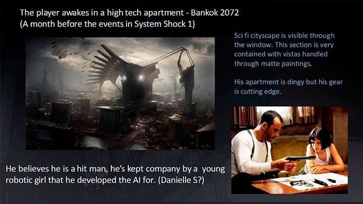 Во втором документе содержится несколько вариантов концепции проекта, наибольший интерес из которых представляет первый. Согласно ему, события начинаются с пробуждения героя в бангкокском отеле в 2072 году, за месяц до завязки оригинальной System Shock. Вскоре в номере появляется механизированная девочка Даниэлла, образ которой основывался на Матильде из знаменитого боевика «Леон». Однако в определенный момент герой понимает, что попал во временную петлю и переживает заново один и тот же день, а на самом деле находится в высокотехнологичной лаборатории, выстроенной на остове огромного инопланетного корабля и наполненной плодами неудавшихся экспериментов над живыми существами.