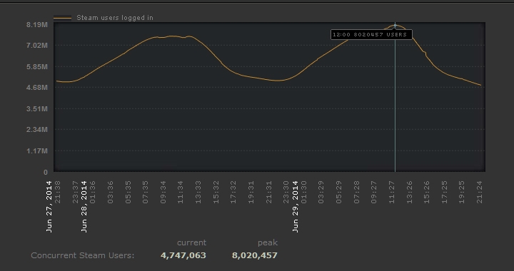 Спустя полгода после действовавшего рекорда по количеству одновременно пребывающих в Steam пользователей в минувшие выходные был зафиксирован новый. В предпоследний день летней распродажи, 29 июня, примерно в 12:00 по тихоокеанскому времени (в 1:00 30 июня по московскому) число пользователей онлайн в сервисе достигло рекордного значения — 8 020 457.