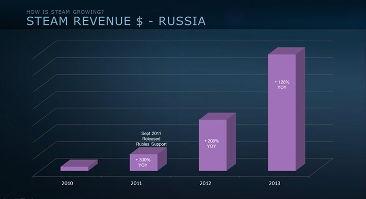 Напомним, что общее количество активных пользователей Steam во время последней рождественской распродажи превысило 75 млн. Эта цифра была озвучена на конференции Steam Dev Days, проходившей 15–16 января в Сиэтле. Там же сотрудники Valve сообщили, что 81% доходов сервиса приходится на Северную Америку и Западную Европу, а Россия приносит компании только 5% доходов. Однако русскоязычные рынки, а также бразильский, показали наибольший прирост — 128% и 75% соответственно.