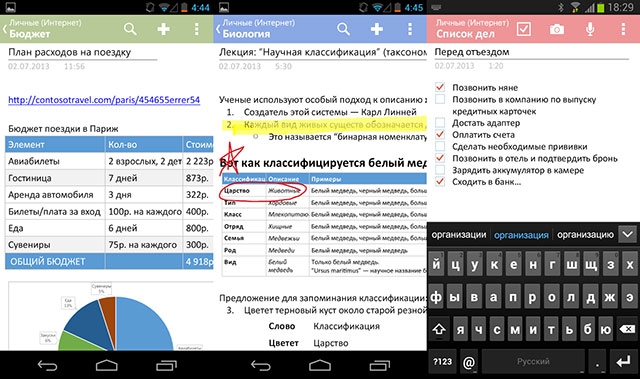Android-версия приложения OneNote также получила существенное обновление. В частности, оно было серьёзно оптимизировано для работы на планшетах. Появилась возможность рукописного ввода от руки пером или пальцем, добавлены разнообразные возможности форматирования (тип и размер шрифта, выравнивание и теги).