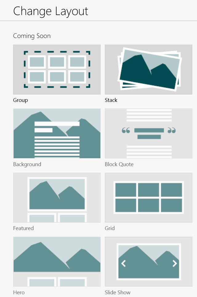 Пользователь может выбрать самые разные линейные и нелинейные макеты для представления своих материалов. Например, выбрав набор фотографий из OneDrive или Facebook, пользователь может выбрать тип интерактивного альбома, в котором они будут выводиться.