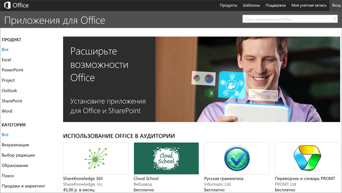 В интернет-маркете Office Store представлены не входящие в офисный набор продукты и инструменты от независимых поставщиков программного обеспечения, разработчиков и стартапов, а также партнеров Microsoft. Для удобства работы с магазином представленный в нем ассортимент рассортирован по категориям («Визуализация», «Продажи и маркетинг», «Управление отношениями с клиентами», «Производительность» и др.) и компонентам Office 365, с которыми совместимо то или иное приложение. Покупки в Office Store привязываются к учетной записи пользователя, поэтому доступ к приложениям возможен с любого устройства при авторизации в системе Microsoft. Все цены указаны в рублях.