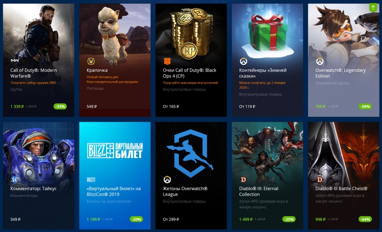 Diablo III можно приобрести также вдвое дешевле — всего за 499 ₽; причём скидки касаются Reaper of Souls, Battle Chest, «Возвращения некроманта» и Eternal Collection. В бесплатно распространяемой Heroes of the Storm скидка в 50% во внутриигровом магазине относится к целому ряду героев, обликов и транспорта. Наконец, до 6 января поклонники Call of Duty могут приобрести со скидками Modern Warfare (33% — 1339 ₽) и Black Ops 4 (60% — 799 ₽).