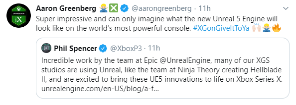 «Невероятная работа команды разработчиков Unreal Engine из Epic Games, — написал Спенсер в Twitter. — Unreal используют многие коллективы Xbox Game Studios, в том числе Ninja Theory, которая сейчас готовит Senua«s Saga: Hellblade II. Они с нетерпением ждут возможности перенести новшества Unreal Engine 5 на Xbox Series X».