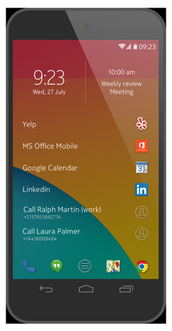 Компания решила отойти от многостраничного интерфейса и поместить всё самое необходимое на один экран. В разное время суток на дисплей выводится набор наиболее используемых приложений. А для выбора не присутствующей на экране программы достаточно просто написать пальцем первую букву её названия, а затем выбрать из сокращённого алфавитного списка.